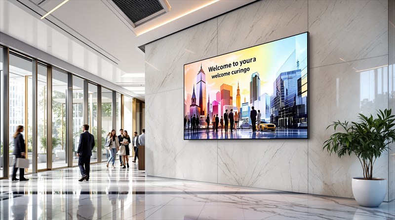 企業のエントランスで存在感を発揮。企業情報、SDGsの取り組み、来客案内などを大画面で印象的に表示。