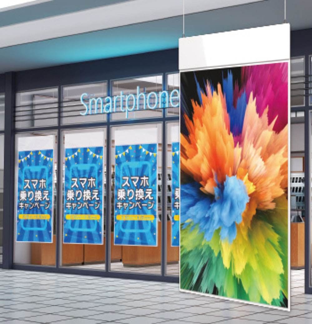 表と裏に異なる 2 種類のコンテンツを発信可能なうえ、超薄型で高輝度の設計により省スペースかつ高い訴求力を実現