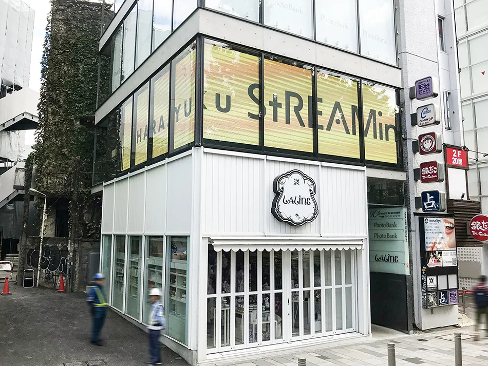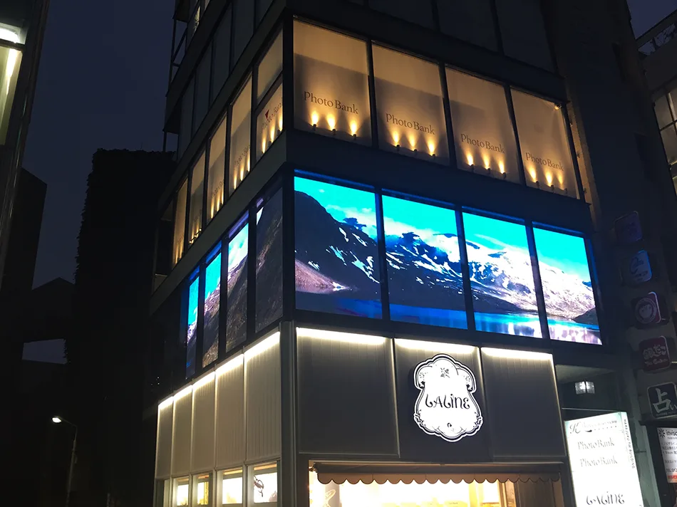 原宿駅前の好立地な美容院のガラス面に沿って、表示面を外に向けて屋内にLEDビジョンを設置しました。