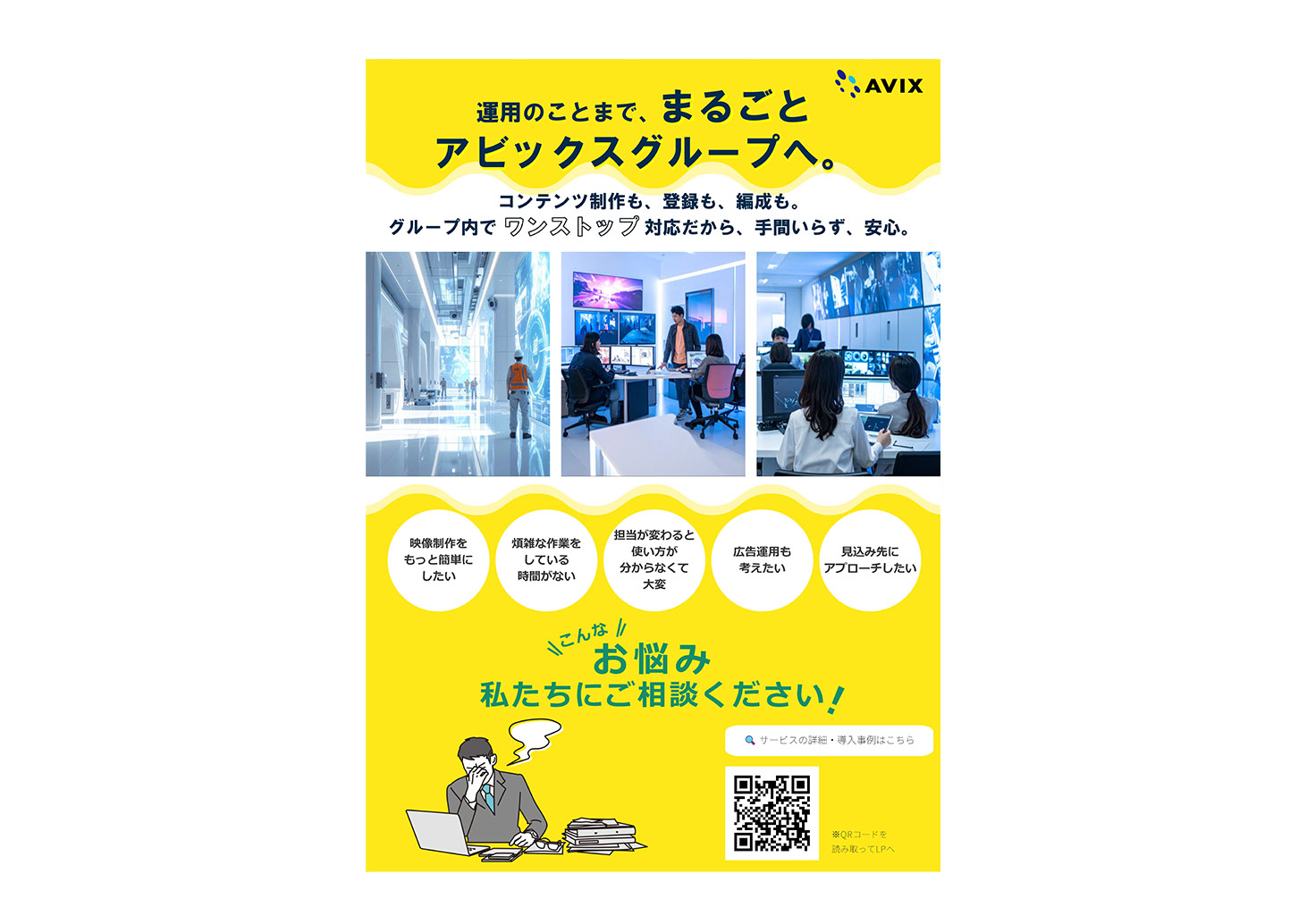 デジタルサイネージを初めて導入検討されている方から、ワンランク上のノウハウを知りたい方のために「デジタルサイネージお役立ち資料」(PDF)をご用意しております。 さらに、アビックスの製品・サービスの資料(PDF)は「カタログ/チラシ/パンフレット」よりダウンロードできます。 是非、各種ダウンロードしてご活用ください。 その他の導入事例や、価格などのご相談も承っておりますので、お気軽にお問い合わせください。※必要事項をご入力いただくと、登録されたメールアドレス宛にPDFリンク付きメールが自動で送信されます