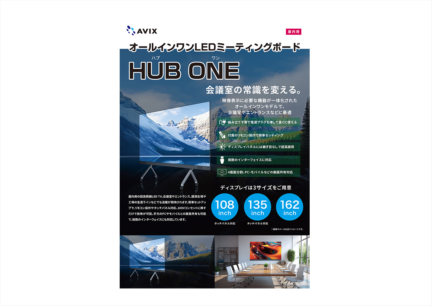 屋内用の超高精細LED TV。会議室やエントランス、講演会場や工場の生産ラインなどでも活躍が期待されます。簡単セットアップで、リモコン操作やタッチパネル対応、100Vコンセントに挿すだけで放映が可能。