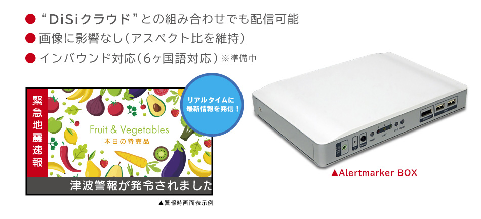 Alertmarker*(アラートマーカー)は、既設の多様なディスプレイのHDMIケーブルにAlertmarker BoXを接続することで、本来の映像を妨げることなく、災害情報・生活支援情報を視覚配信するソリューションです。